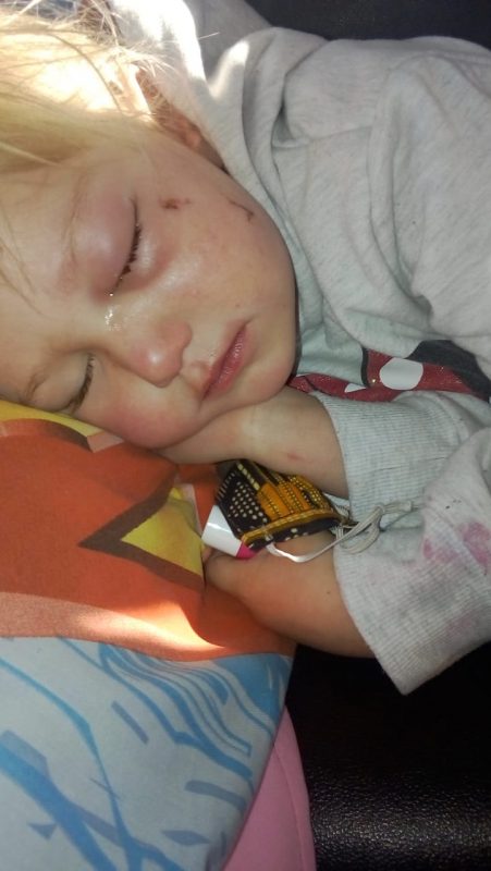 Leonel het geval terwyl sy ‘n skêr in haar handjies gehou het. Die skêr het haar linkeroog en wang gepenetreer.